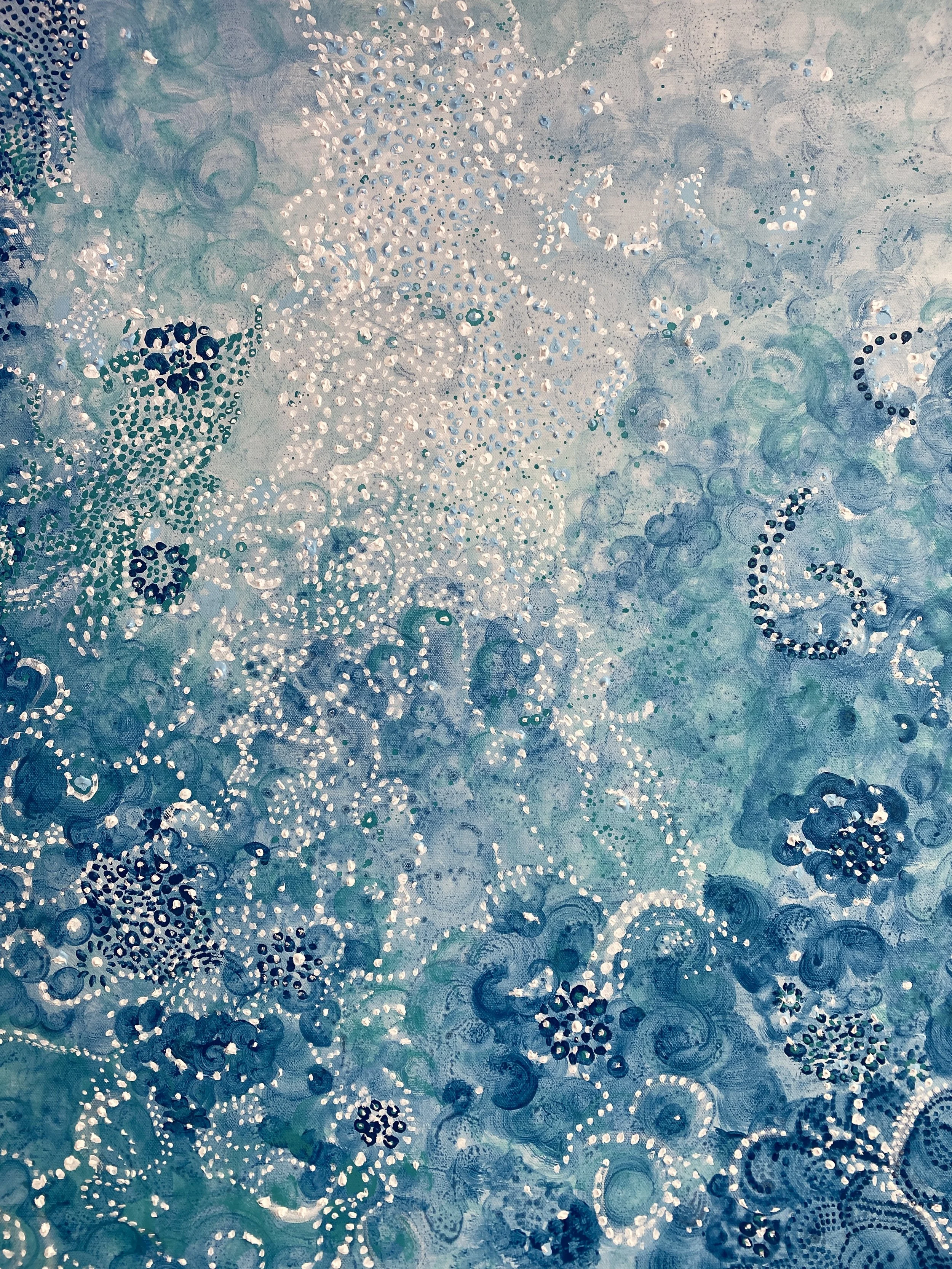 Sheri's coastal abstract paintings, created with acrylics and mixed mediums, feature a unique stippling technique that adds rich texture and depth. This meditative process is carefully crafted to evoke the tranquility of water and sky, inviting the viewer into a serene coastal experience. Each piece reflects intentional artistry, capturing the peaceful essence of the sea through layered textures and calming hues.